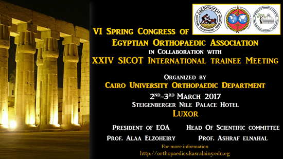 We would like to welcome you to the annual spring Egyptian Orthopaedic Association (EOA) Congress, which will be organised by the Cairo University orthopaedics department in Luxor, Egypt, on 2 and 3 March 2017, with the strong contribution of the SICOT organisation.