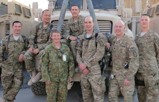 2012: serving with the US Navy in the Middle East at a NATO Role 3 Multinational Medical Unit: the orthopaedic surgical team (handover time with extras present) standing in front of an armoured ambulance.